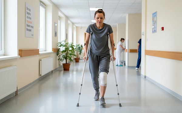 - Primele 24-48 ore: Deplasări esențiale cu sprijin complet pe cârje