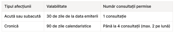 - Valabilitate pentru afecțiuni acute sau subacute: 30 de zile de la data emiterii.