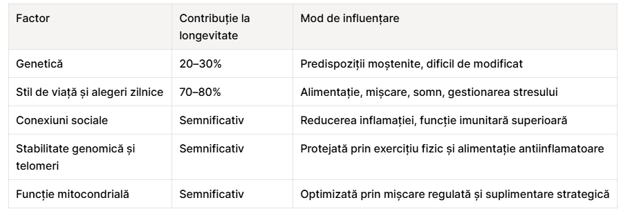 Factorii care contribuie la o viață lungă și sănătoasă sunt studiați intens de cercetători din întreaga lume, iar concluziile sunt, în mare parte, surprinzător de accesibile. Deși genetica joacă un rol în determinarea longevității, cercetările în domeniul epigeneticii demonstrează că doar 20–30% din durata vieții este determinată genetic, restul de 70–80% depinzând de alegerile zilnice pe care le facem. Aceasta înseamnă că fiecare individ deține un control substanțial asupra propriei îmbătrâniri.