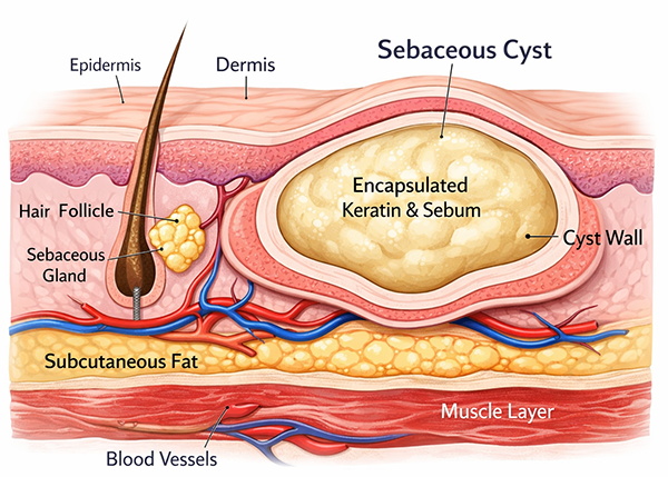 Formarea unui chist sebaceu la nivelul pielii rezultă din blocarea canalelor de evacuare ale glandele sebacee tratament sau ale foliculilor pilari. Când sebumul nu mai poate fi eliminat la suprafața pielii, acesta se acumulează progresiv, determinând dilatarea structurii și formarea unei cavități închise. Keratina produsă de celulele epiteliale contribuie, de asemenea, la conținutul chistului. Acest proces de obstrucție poate fi declanșat de diverse mecanisme, inclusiv inflamația locală, traumatisme minore sau modificări ale compoziției sebumului.