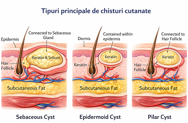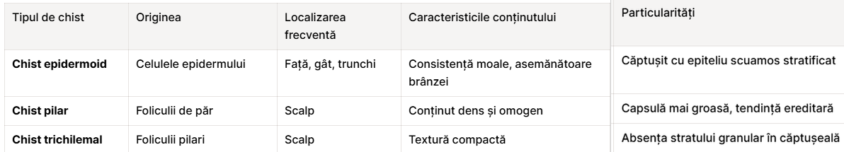 Deși termenii sunt adesea folosiți interschimbabil, există diferențe importante între tipurile de formaţiuni chistice care apar la nivelul pielii. Pe lângă chisturile sebacee, epidermoide și pilare, există și alte tipuri, cum ar fi chistul sinovial, fiecare cu particularitățile sale.