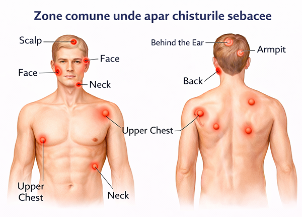 Expunerea profesională la substanțe chimice sau uleiuri industriale poate, de asemenea, contribui la obstrucția glandelor sebacee. În continuare, vom explora localizările frecvente ale chisturilor sebacee și motivele pentru care anumite zone ale corpului sunt mai susceptibile la dezvoltarea acestor formațiuni.
