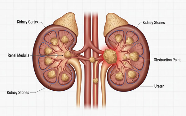 Durerea intensă este generată de contracțiile musculaturii ureterale, care încearcă să împingă calculul prin canalul îngust. Această blocare duce la o creștere a presiunii în interiorul rinichiului, cauzând durerea specifică colicii.