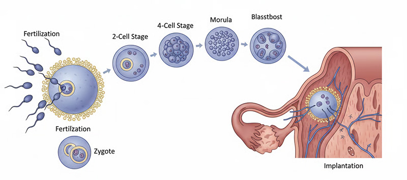 În primele zile după concepție, zigotul începe o diviziune celulară rapidă, dublându-și numărul de celule la fiecare 12-24 de ore. Această masă de celule, numită morula, călătorește prin trompa uterină spre uter, unde se va implanta în peretele uterin în jurul zilei a șaptea după fertilizare. Procesul de implantare este crucial pentru continuarea sarcinii și poate fi însoțit de o ușoară sângerare, cunoscută sub numele de sângerare de implantare.
