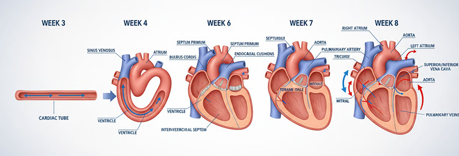 Inima începe să se formeze în jurul zilei a 18-19 de la concepție, în cea de-a treia saptamana de dezvoltare embrionară. Procesul începe cu formarea unei structuri simple, tubulare, care se va plia și dezvolta treptat în cele patru camere ale inimii mature. Primele bătăi ale inimii apar în jurul zilei a 21-22 de la fertilizare, ceea ce corespunde cu sfârșitul celei de-a cincea saptamani de sarcina.