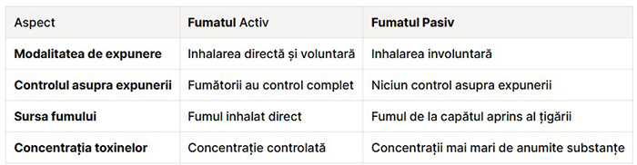 Deși ambele forme de expunere la fumul de tutun prezintă riscuri, există diferențe între fumatul activ și cel pasiv în ceea ce privește modalitatea de expunere, controlul asupra situației și tipul de substanțe inhalate.