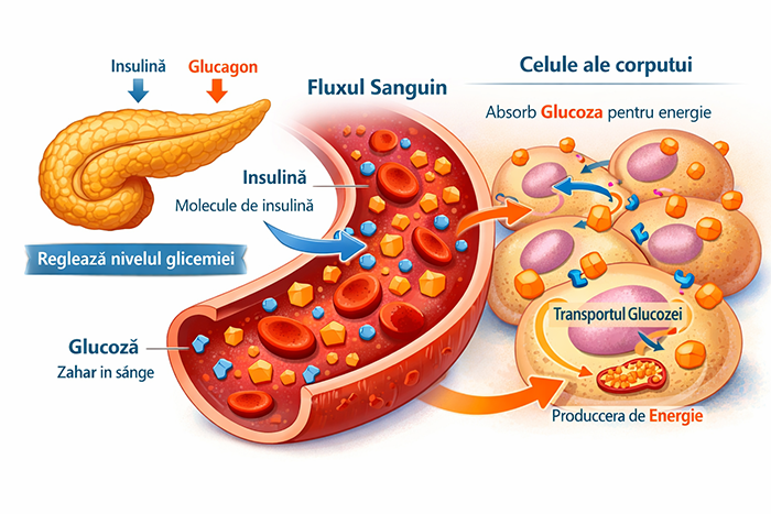- Insulina: Produsă de celulele beta, permite glucozei să pătrundă în celule