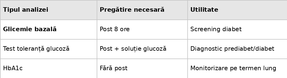Hemoglobina glicozilată (HbA1c) oferă o perspectivă pe termen lung, reflectând nivelul mediu al glicemiei din ultimele două până la trei luni. Această analiză nu necesită post și poate fi efectuată oricând în timpul zilei, fiind utilă atât pentru diagnostic, cât și pentru monitorizarea controlului glicemic la persoanele cu diabet. O valoare sub 5.7% este considerată normală, între 5.7% și 6.4% indică prediabet, iar peste 6.5% sugerează diabet.