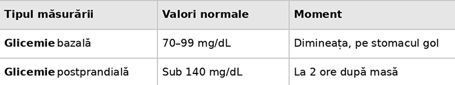 - Valori acceptabile: Sub 140 mg/dL la două ore după masă