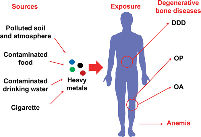 Metalele grele în corp ajung prin multiple căi de expunere. Expunerea industrială este o sursă principală, în special pentru lucrătorii din industria chimică, metalurgică sau de vopsire. Poluarea aerului și a apei constituie o altă cale importantă de contaminare, emisiile industriale și arderea combustibililor contribuind la răspândirea acestor substanțe toxice în mediul înconjurător.