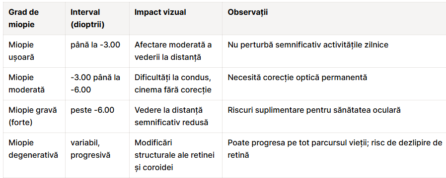 Severitatea miopiei se măsoară în dioptrii, unități care exprimă puterea de corecție optică necesară. În cazul miopiei, valorile sunt întotdeauna negative, iar cu cât numărul este mai mare în valoare absolută, cu atât afecțiunea este mai pronunțată. O miopie de -1.00 dioptrie este considerată ușoară, în timp ce una de -8.00 dioptrii indică o formă severă cu implicații clinice semnificative.