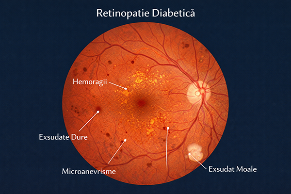 Retinopatia diabetică este o complicație microvasculară a diabetului, rezultând din deteriorarea vaselor de sânge retiniene cauzată de hiperglicemia cronică. Evoluează de la retinopatia nonproliferativă ușoară (microanevrisme și hemoragii) până la retinopatia proliferativă (vase de sânge noi anormale). Edemul macular diabetic, acumularea de lichid în macula, poate apărea în orice stadiu și este principala cauză de pierdere a vederii la diabetici.