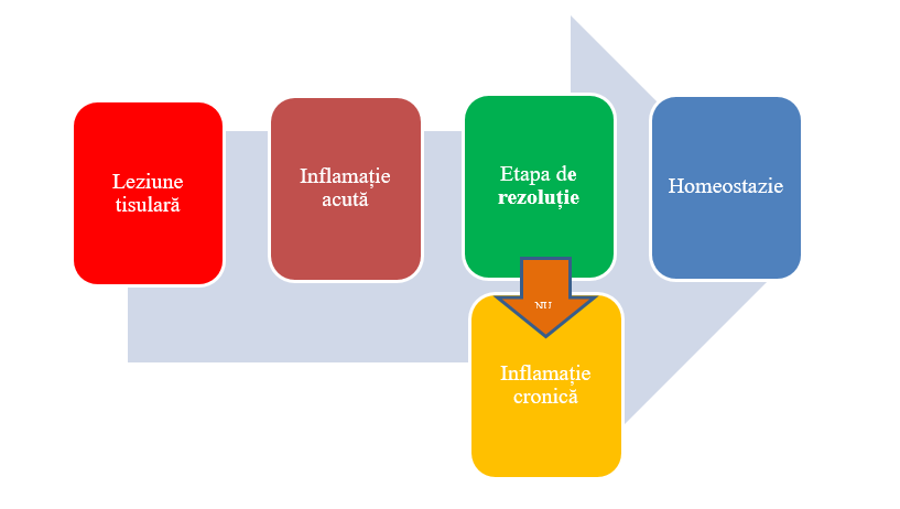 Într-o primă etapă se declanșează o reacție inflamatorie acută, un răspuns fiziologic de scurtă durată, cu scopul de a iniția procesul de reparare tisulară și vindecare locală. Dacă în timp util procesul inflamator nu se remite, se progresează către o cronicizare a inflamației, care poate dura luni de zile sau chiar ani (Figura nr.1). Inflamația cronică este direct corelată cu patogeneza unor multiple afecțiuni ca: ateroscleroza, diabet zaharat tip II, artrită reumatoidă, boala Alzheimer (Medzhitov, 2008, 2010; Tabas and Glass, 2013) sau poate fi factor favorizant pentru carcinogeneză (Lee et al., 2013).