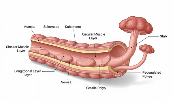 Clasificarea polipilor colonici se bazează pe aspectul morfologic și caracteristicile histopatologice. Din punct de vedere morfologic, polipul sesil colon prezintă o bază largă de implantare direct pe mucoasa intestinală, fără pedicul vascular. Această formă creează dificultăți tehnice la îndepărtare și necesită atenție sporită din cauza riscului crescut de sângerare.