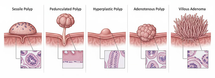 Polipul adenomatos tubular constituie aproximativ 80% din totalul polipilor colonici și prezintă un risc moderat de transformare malignă. Polipii adenomatoși viloși și tubulo-viloși au un risc de malignizare mai ridicat, necesitând monitorizare atentă. Polipii inflamatori sau pseudopolipii apar secundar proceselor inflamatorii cronice și au un potențial oncogen scăzut.