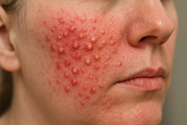 Aceasta este o formă mai avansată, manifestată prin papule și pustule inflamatorii, asemănătoare acneei, înroșire persistentă a pielii și, în cazuri severe, edem facial.