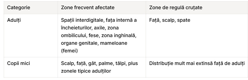 - Zone frecvent afectate: Spațiile interdigitale, încheieturile mâinilor, axilele, zona taliei, fesele și regiunea genitală.
