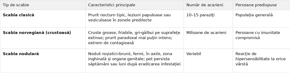 Nu toate cazurile de scabie se prezintă în același mod. Medicii dermatologi descriu mai multe forme clinice, fiecare cu particularități proprii care influențează atât diagnosticul, cât și abordarea terapeutică.