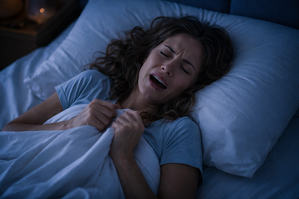 Este scrâșnitul sau încleștarea involuntară a dinților în timpul somnului, care poate duce la dureri de maxilar, uzura dinților și dureri de cap.