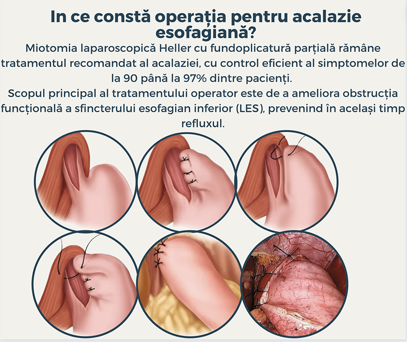 Miotomia laparoscopică Heller cu fundoplicatură are o rată de satisfacție a pacienților de peste 95%. Spitalizarea este de 24 ore, iar recuperarea este extrem de rapidă.
