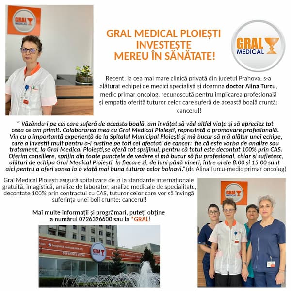 Echipa de medici oncologi din cadrul Gral Medical Ploiesti s-a completat cu Dr. Alina Cristina Turcu, medic primar oncologie in contract cu CAS Prahova si dr Ghizdavescu Gabriel Doru - medic primar oncologie. Pentru programari accesati sectiunea de programari online.